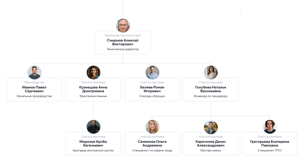 Классическая «пирамида»: генеральный директор → руководители отделов → рядовые сотрудники.